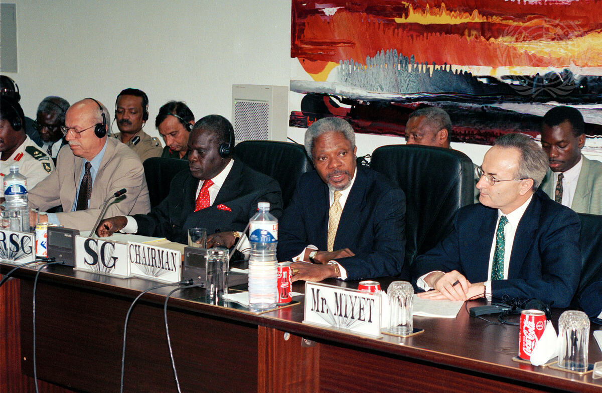 Secretary-General Kofi A. Annan (second from right) addresses the special session of the Joint Commission in Luanda. On the left is Alioune Blondin Beye, his Special Representative for Angola and on the right is Bernard Miyet, Under-Secretary-General for Peacekeeping Operations.