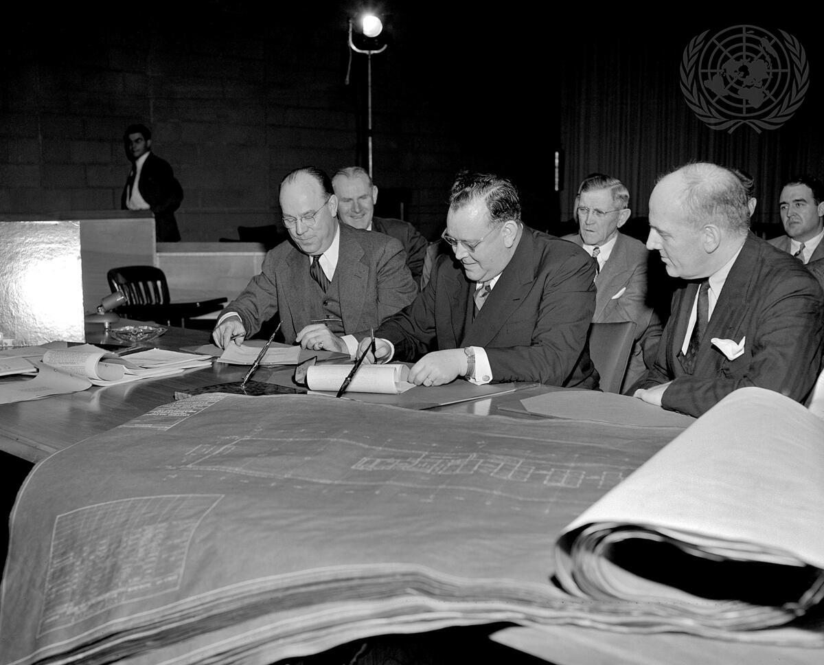 Here, Secretary-General Trygve Lie signs the contract on behalf of the United Nations. At left, is Mr. Lou R. Crandall, who signed on behalf of the four building firms which combined their resources to form a single corporation for the U.N. project. At right, Wallace K. Harrison, chief of the Headquarters Planning Office.