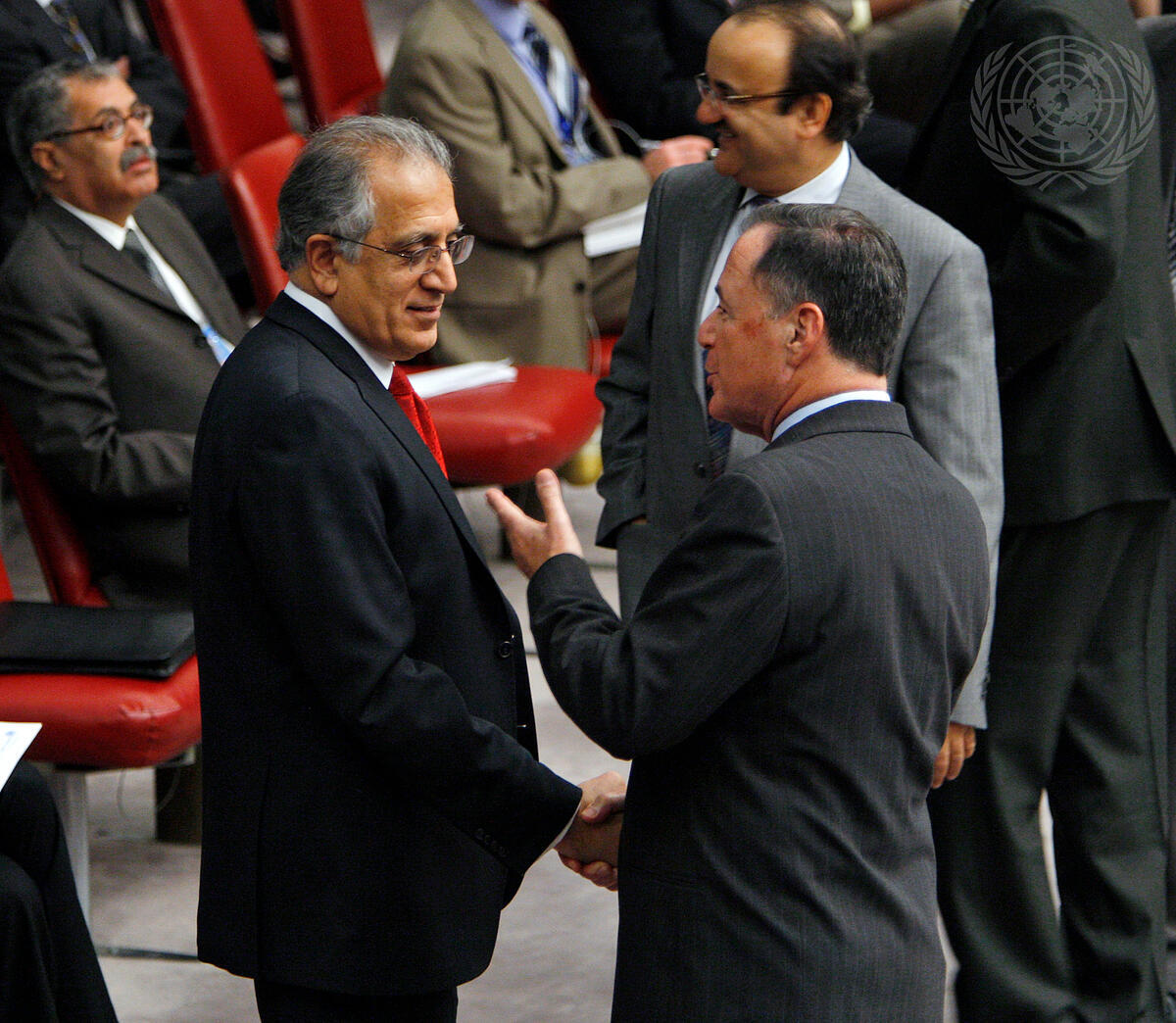 Zalmay Khalilzad (second from left), Permanent Representative of the United States (US) of America to the United Nations, speaks to Dan Gillerman, Permanent Representative of Israel to the United Nations, before the Security Council meeting on non-proliferation of nuclear weapons.