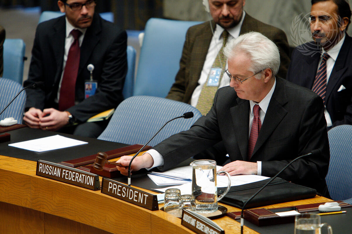 Vitaly Churkin (right), Permanent Representative of the Russian Federation to the United Nations, and President of the Security Council for March, presides over a meeting on non-proliferation of nuclear weapons.