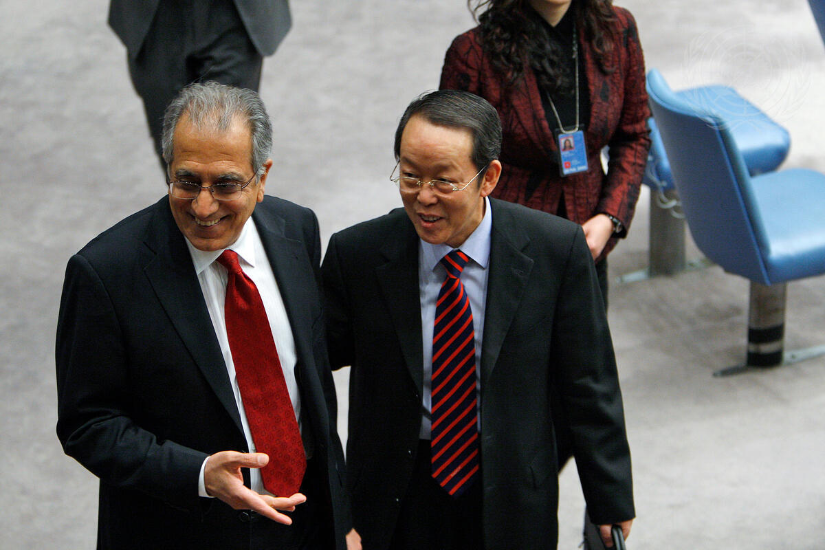 Wang Guangya (right), Permanent Representative of the People's Republic of China to the United Nations, and Zalmay Khalilzad, Permanent Representative of the United States (US) of America to the United Nations, before the Security Council meeting on non-proliferation of nuclear weapons.