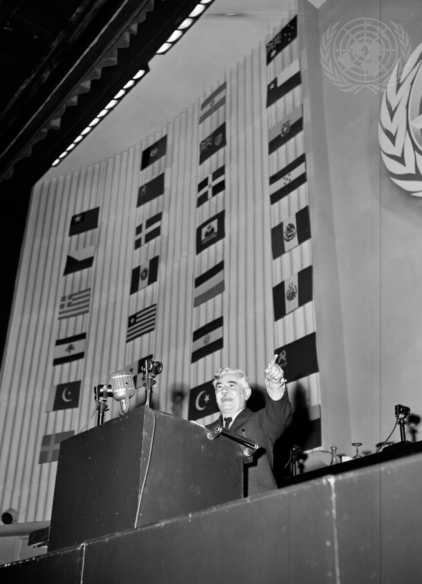 At the Palais de Chaillot, Dr. Dimitri Z. Manuilsky (Ukrainian USSR) addresses the General Assembly on the Declaration of Human Rights. Mr. Manuilsky said that his delegation would support the Soviet proposal that consideration of the Declaration be postponed until the 4th Session of the Assembly.