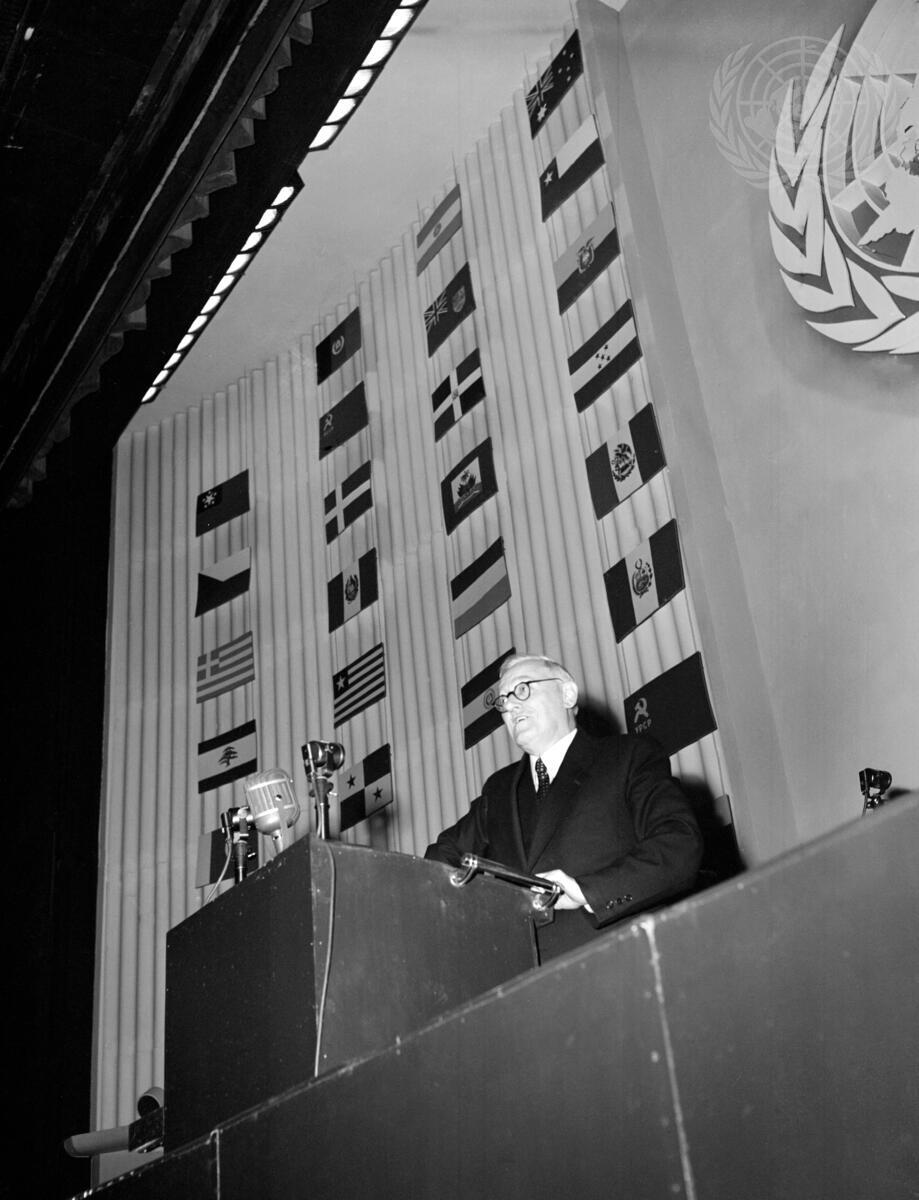At the Palais de Chaillot, Andrei Vyshinsky (USSR) addresses the Third Session of the General Assembly on the Declaration of Human Rights. Mr. Vyshinsky said that the present Declaration was ""too vague"" and that a number of amendments were needed before it should be adopted.