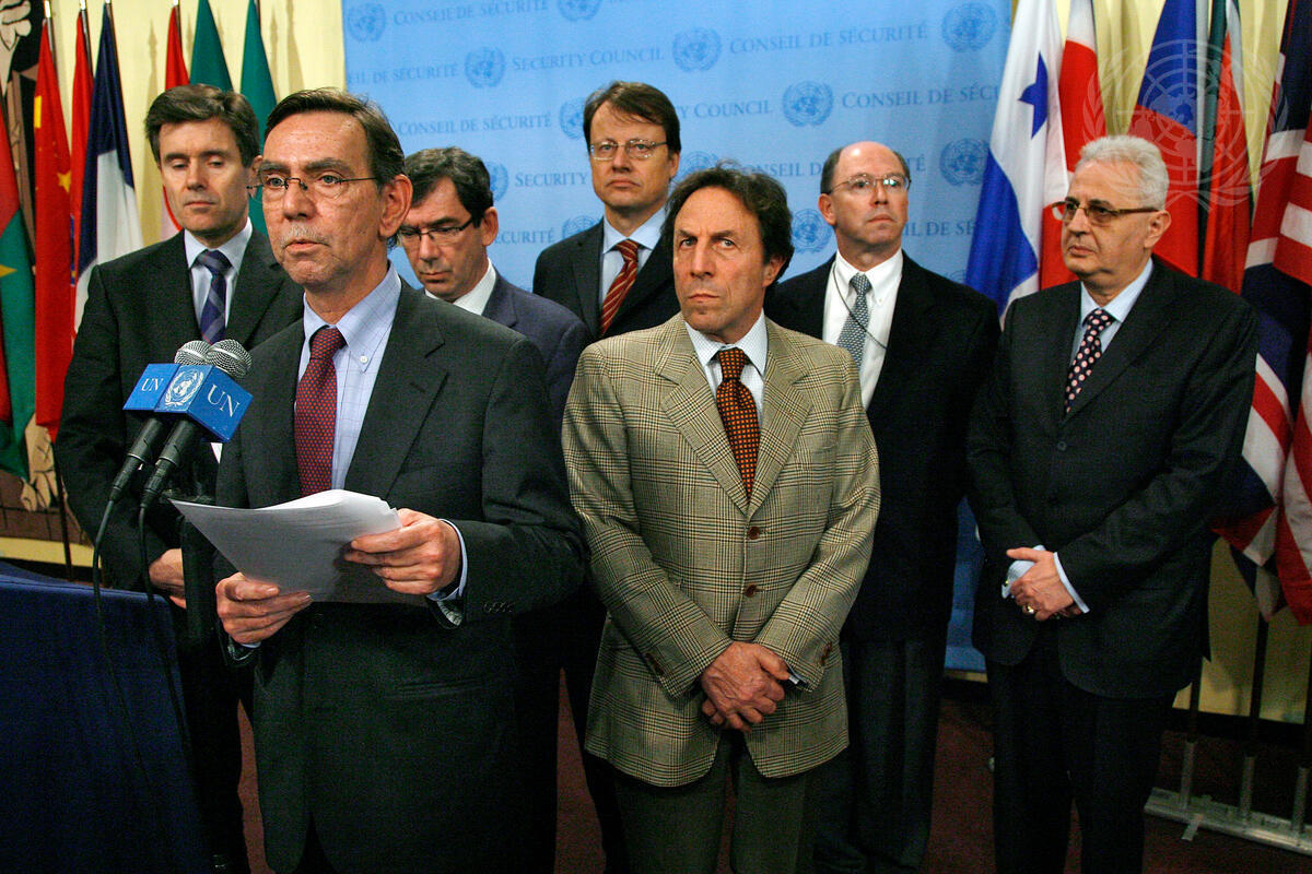 Johan Verbeke (second from left), Permanent Representative of Belgium to the United Nations, addresses correspondents on behalf of the European Union, following the Security Council consultations on the situation in Kosovo.