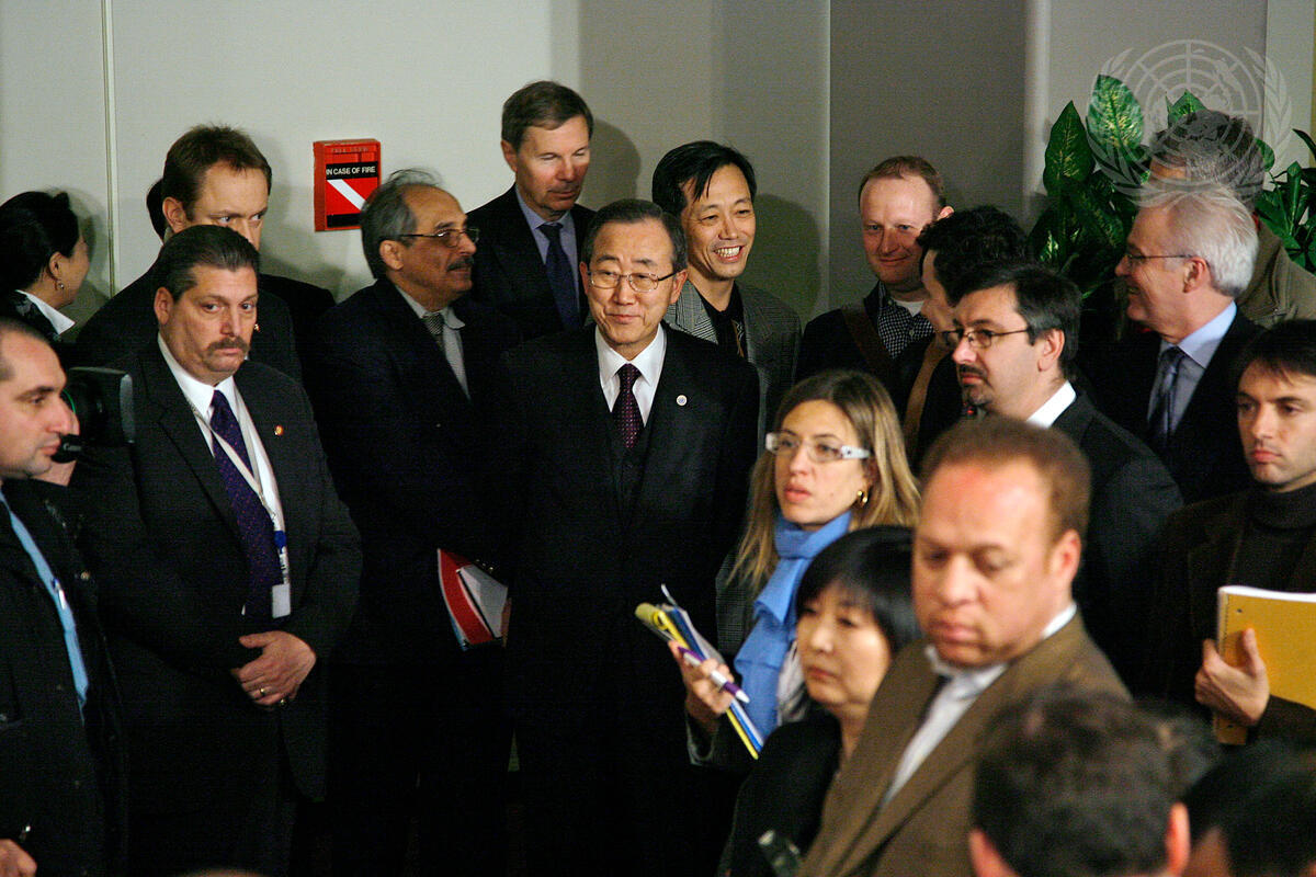 Secretary-General Ban Ki-moon (seventh from left) prepares to brief correspondents outside the Security Council Chamber, following the Council consultations on the situation in Kosovo.