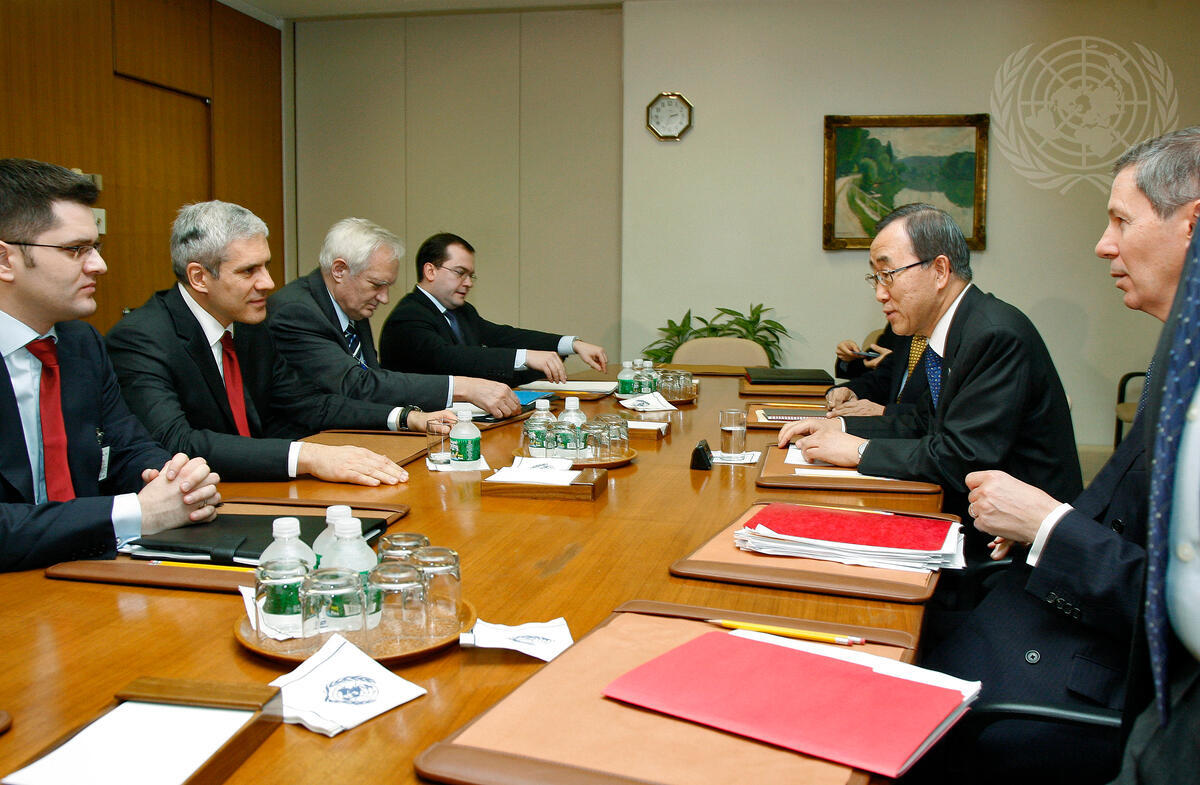 Secretary-General Ban Ki-moon (second from right, right side of table) holds talks with Boris Tadic (second from left, left side of table), President of the Republic of Serbia, prior to an emergency Security Council meeting on Kosovo.