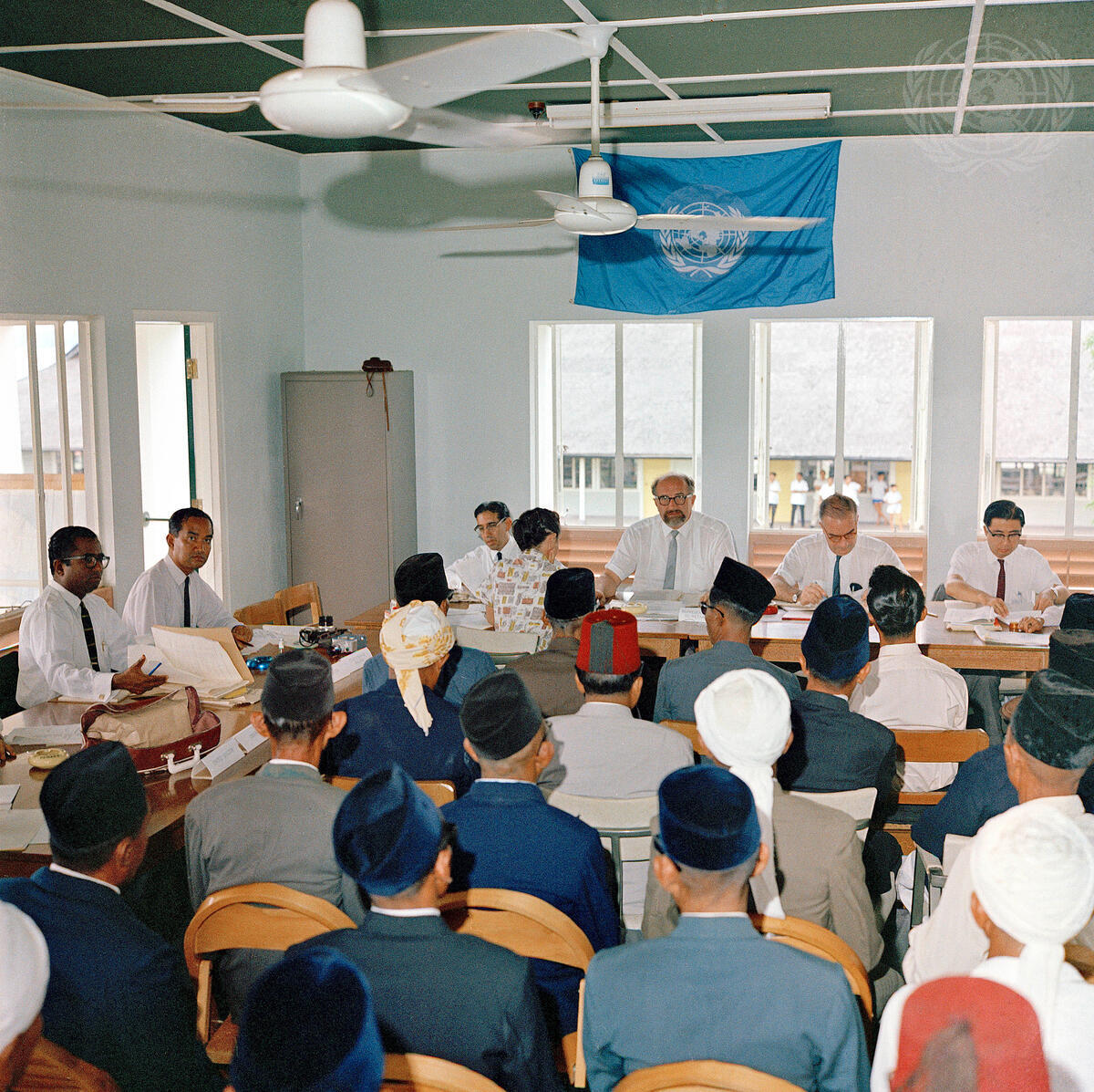 Mr. George Janecek (center, background), Deputy Representative of the Secretary-General, and other UN Officials, are seen here conducting a hearing at Tawau.