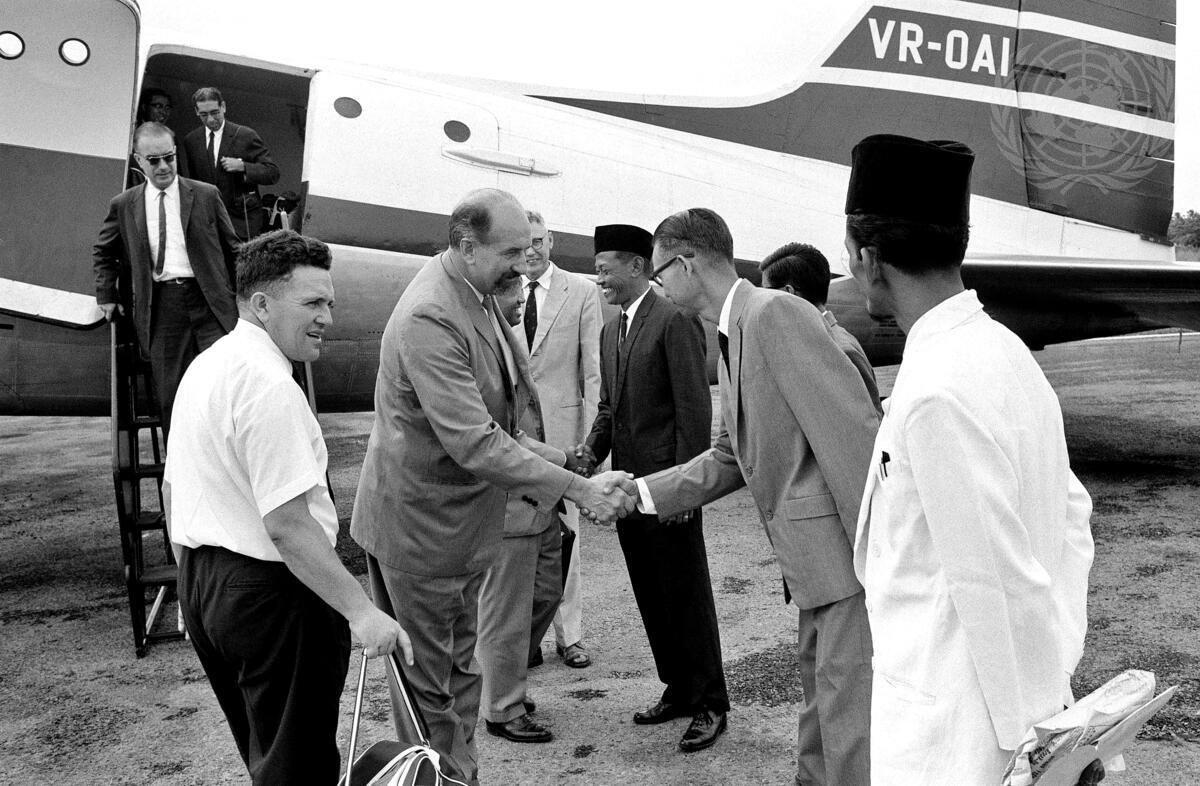 Mr. George Janecek (2nd from left), Deputy Representative of the Secretary-General, is seen shaking hands with local officials shortly after his arrival at Tawau airport.