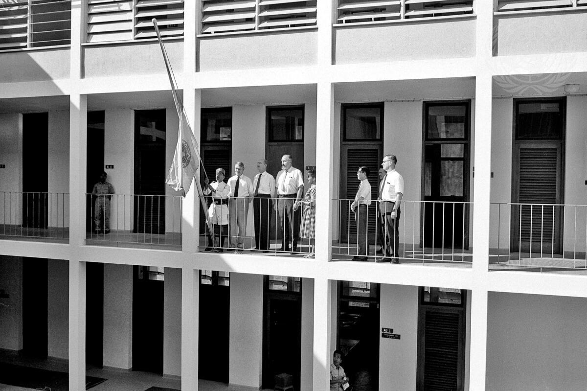Photograph shows flag raising ceremony at temporary UNMAM Headquarters in Jesselton. Left to right are: Mr. R. N. Turner, Chief Secretary of Sabah (North Borneo); Mr. Laurence Michelmore and Mr. George Janecek, Representative and Deputy Representative of the Secretary-General, respectively, and Miss Majorie Richardson.
