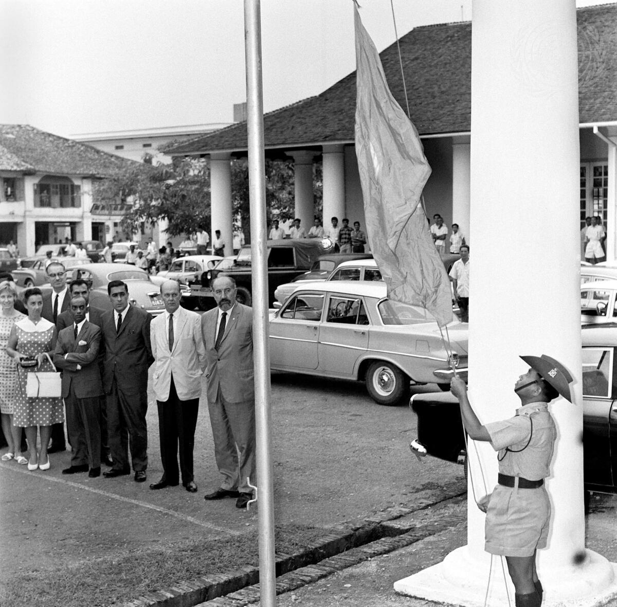Photograph shows flag raising ceremony at temporary UNMAM headquarters in Kuching, Sarawak. Right to left are: Mr. George Janecek, and Mr. Laurence Michelmore, Deputy Representative and Representative of the Secretary- General, respectively, Mr. Jose A. Machado, Mr. Neville Kanakaratne, Miss Majorie Richardson and Miss Leonore Kutz. Back row, are Mr. A. S. Dajani (right) and Mr. George Howard.