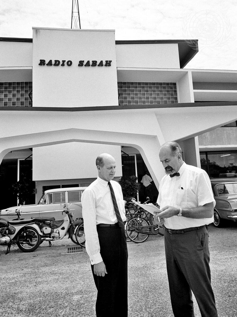 Mr. Laurence Michelmore (left), and Mr. George Janecek, Representative and Deputy Representative of the Secretary-General, respectively, are seen standing outside Radio Sabah, shortly after Mr. Janecek had made a statement over that radio station.