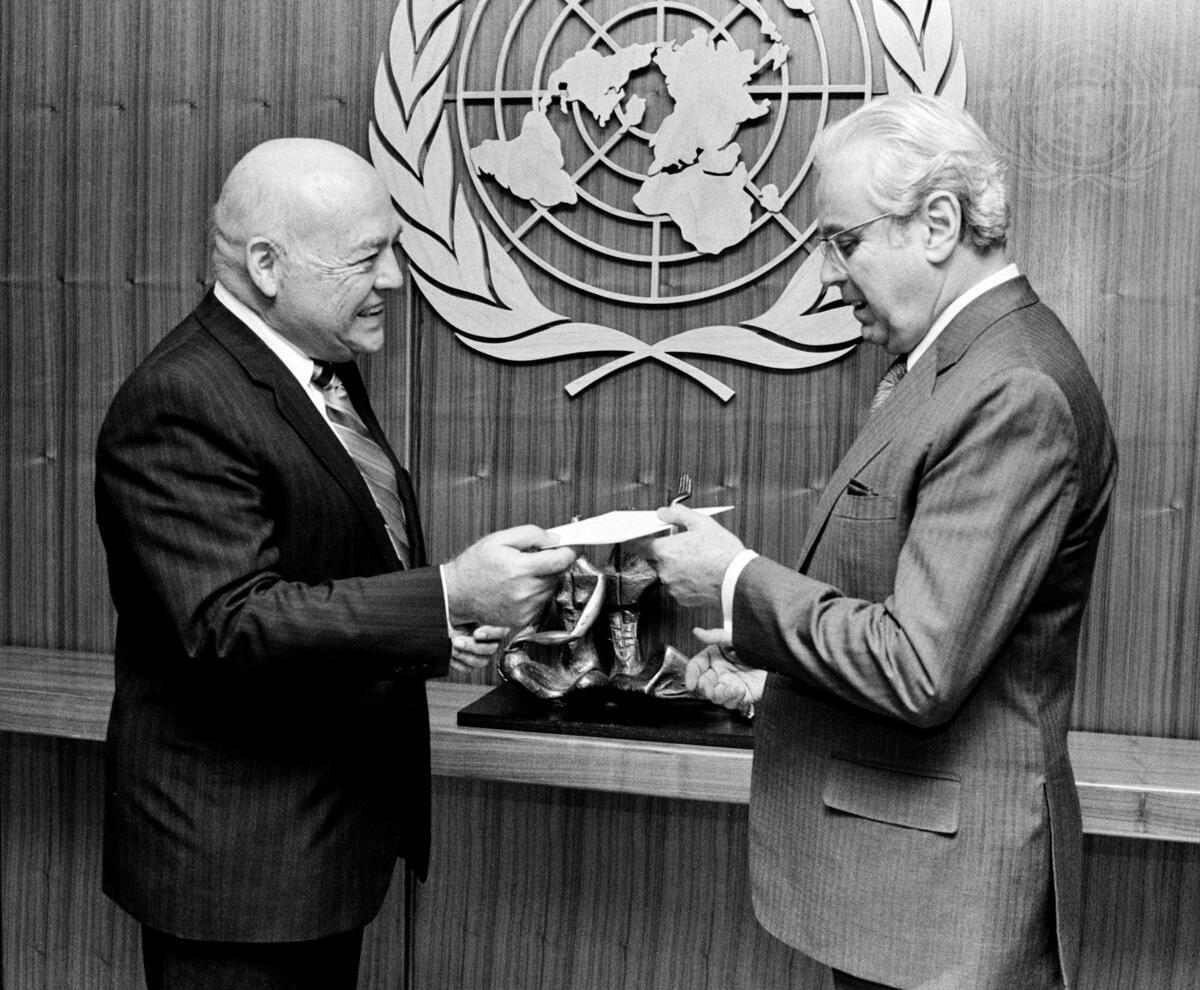 José Roberto Martínez Ordoñez (left), new Permanent Representative of Honduras to the United Nations, presents his credentials to Secretary-General Javier Pérez de Cuéllar.