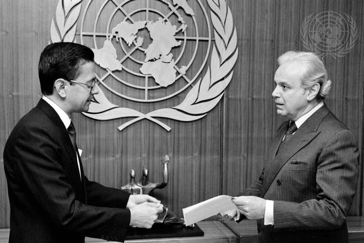 Roberto Flores Bermúdez (left), new Permanent Representative of Honduras to the United Nations, presents his credentials to Secretary-General Javier Pérez de Cuéllar.