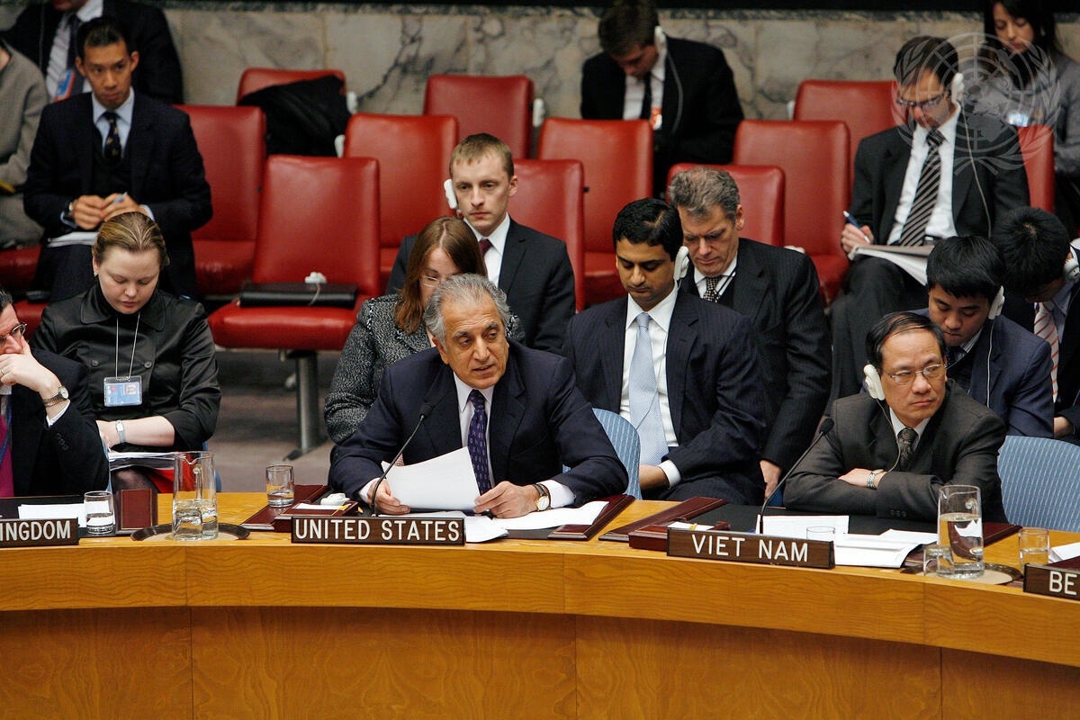 Zalmay Khalilzad, Permanent Representative of the United States to the United Nations (centre front), addresses an urgent meeting of the Security Council on the latest crisis in the Gaza Strip and southern Israel. At right front is Le Luong Minh, Permanent Representative of Viet Nam to the United Nations.