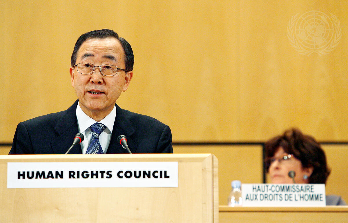 Secretary-General Ban Ki-moon addresses the seventh session of the High-Level Segment of the Human Rights Council, as Louis Arbour (right), United Nations High Commissioner for Human Rights, listens.