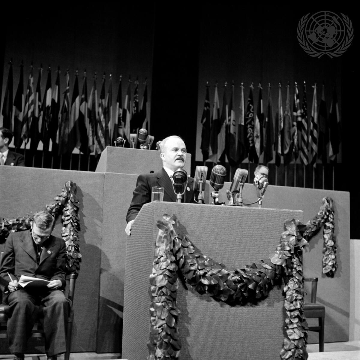 V.M. Molotov (USSR), People's Commissar for Foreign Affairs and Head of his delegation, at the speaker's stand at the 2nd Plenary Session, 27 April 1945.