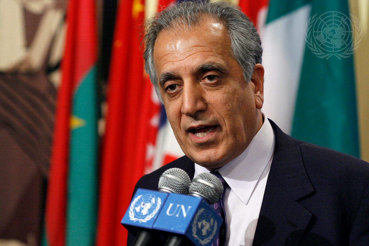 Zalmay Khalilzad, Permanent Representative of the United States of America to the United Nations, briefs journalists outside the Security Council Chamber.