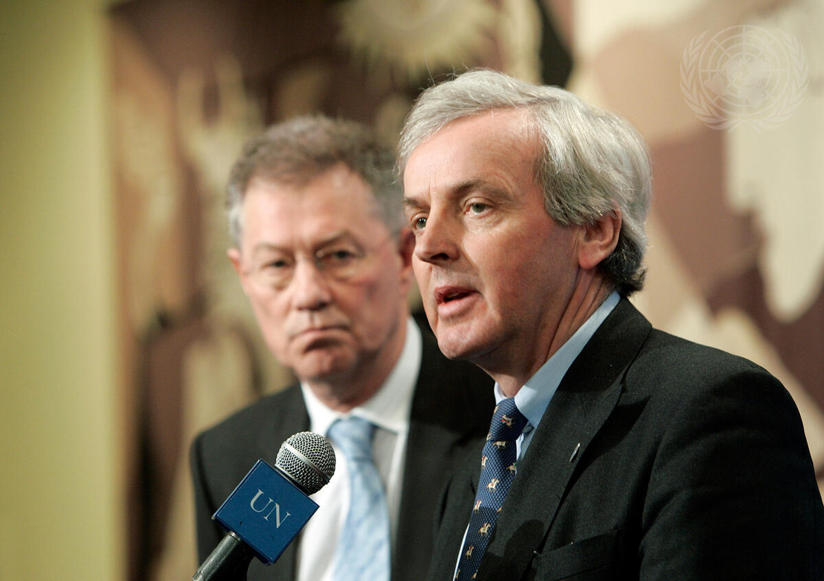 John Holmes (right), Under-Secretary-General for Humanitarian Affairs and Emergency Relief Coordinator, flanked by Robert H. Serry, United Nations Special Coordinator for the Middle East Peace Process and the Personal Representative of the Secretary-General to the Palestine Liberation Organization and the Palestinian Authority, briefs correspondents following a Security Council meeting on the situation in the Middle East, including the Palestinian question.
