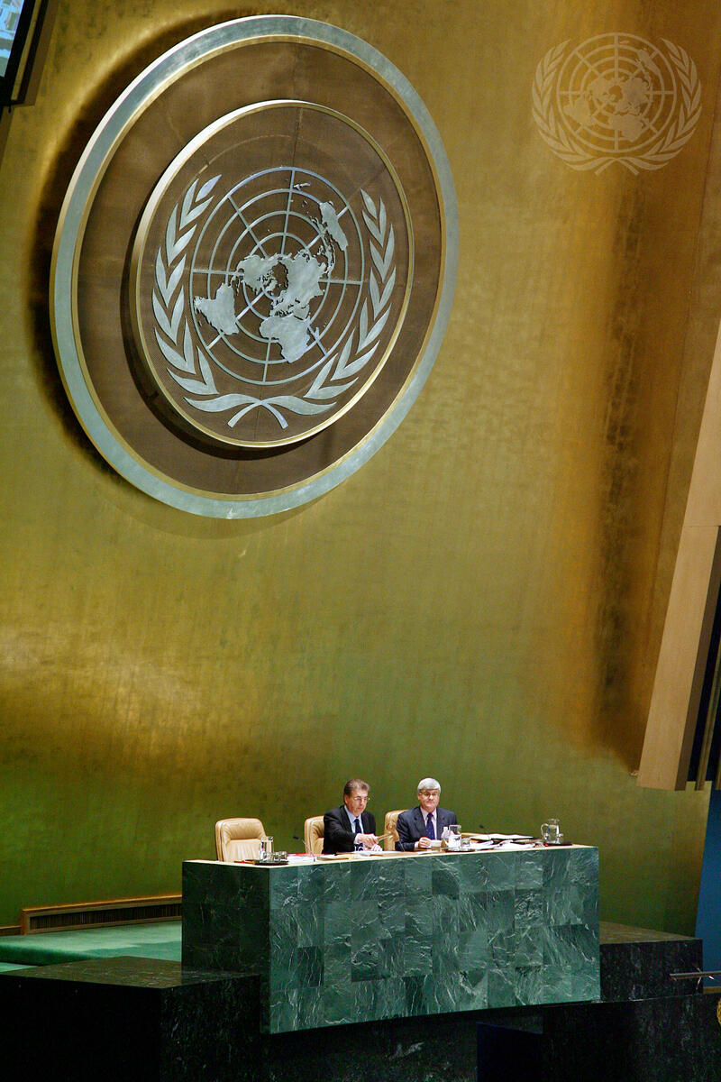 Srgjan Kerim (left), President of the sixty-second session of the United Nations General Assembly, flanked by Ion Botnaru, Chief of the UN General Assembly Affairs Branch, presides over the closing session of the three-day General Assembly thematic debate on ""Addressing Climate Change: The United Nations and the World at Work.""
