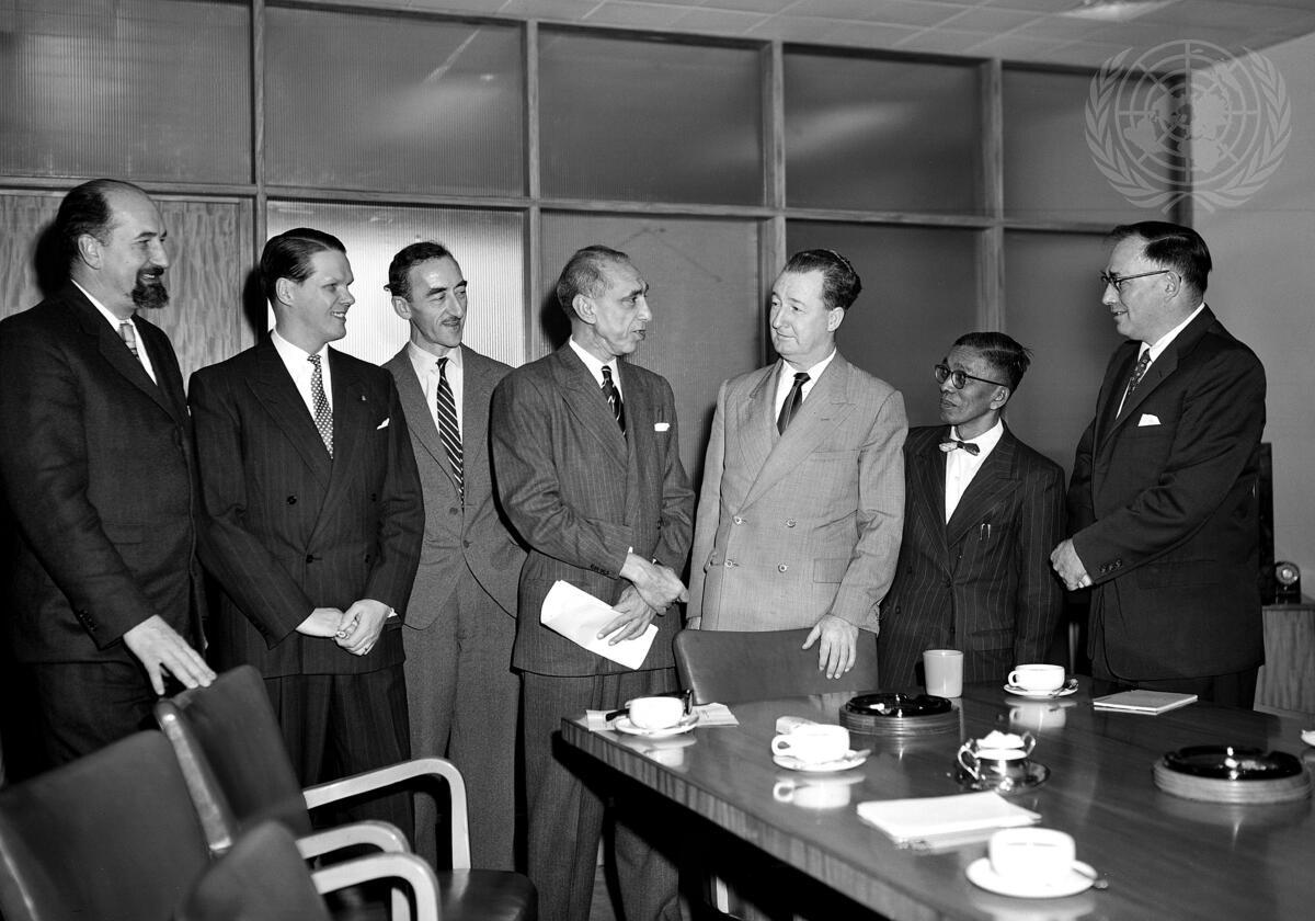 Messrs. Ahmed S. Bokari (center), U.N. Under-Secretary for Public Information; G.J. Janecek (left), Director of the Public Liaison and Distribution Division of the U.N.; and William J. Bruce (right), Chief of the U.N. Education Section, are seen here with four of this year's U.N. Study Tour Award winners - from left to right: Messrs. Paolo K. Killiner of Helsinski, Finland; Terence Lawson of London, England; W.J. Hobbin of Sydney, Australia; and Oo Thein of Rangoon, Burma.