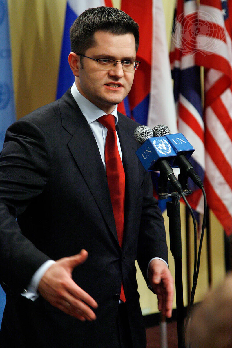 Vuk Jeremic, Foreign Minister of the Republic of Serbia, speaks to correspondents, following a Security Council meeting on Kosovo.