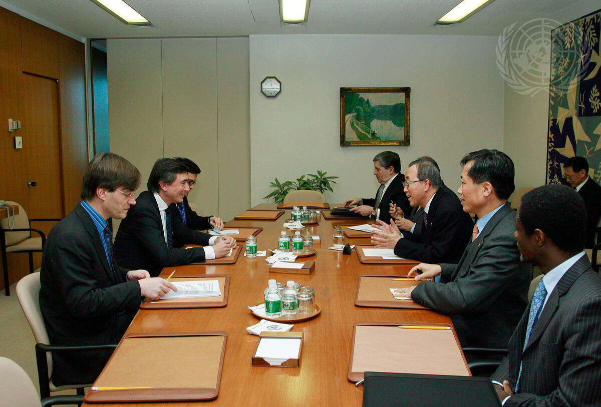 Secretary-General Ban Ki-moon (centre, right side of table) holds a meeting with Philippe Douste-Blazy (centre left), newly appointed United Nations Special Advisor on Innovative Financing for Development and former Minister for Foreign Affairs of France.