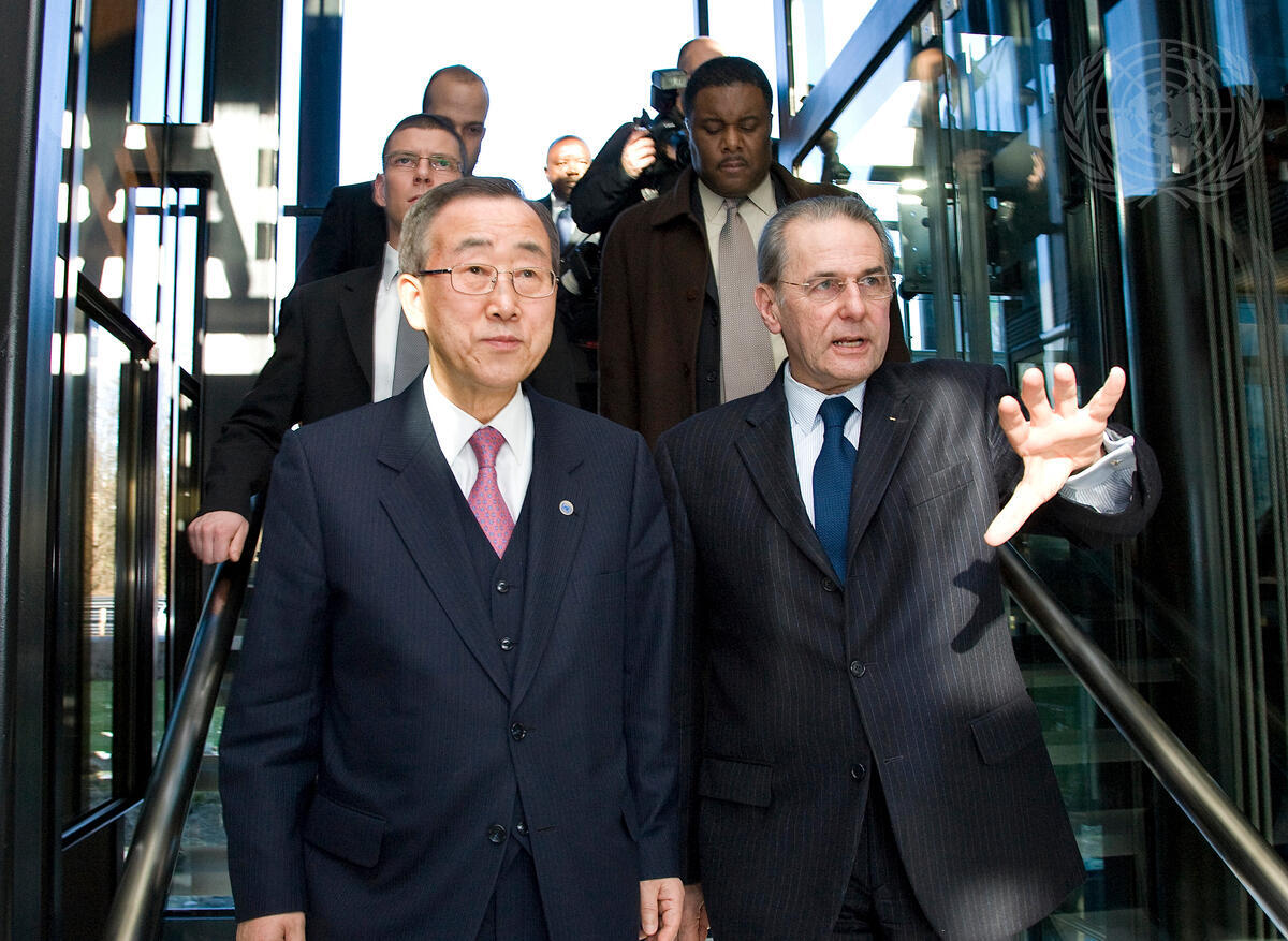 Jacques Rogge (right), President of the International Olympic Committee (IOC), takes Secretary-General Ban Ki-moon (left), on a guided tour of the International Olympic Committee headquarters.
