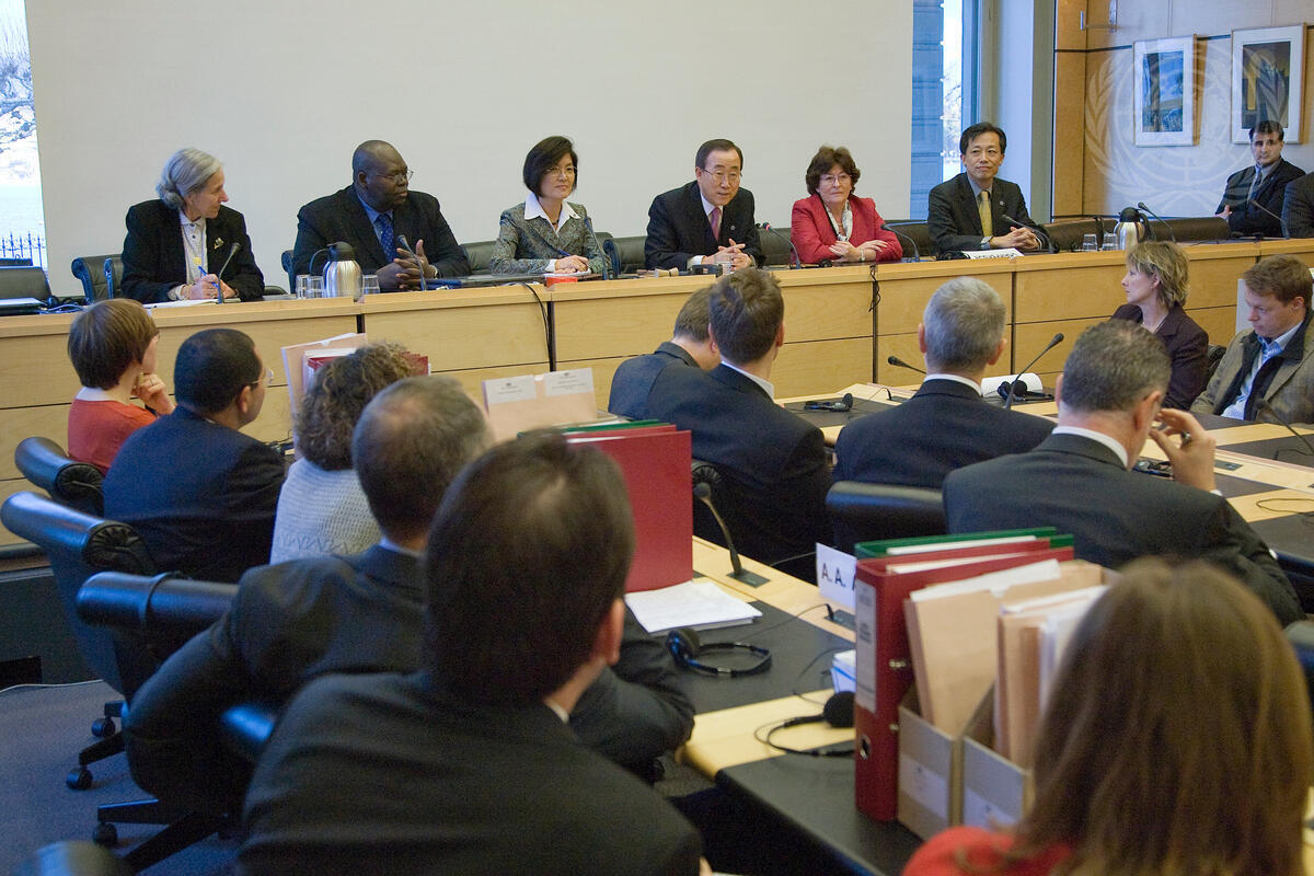 Secretary-General Ban Ki-moon (third from right, at podium), joined by Louise Arbour (third from right), UN High Commissioner for Human Rights, addresses the staff at the Office of the High Commissioner for Human Rights.
