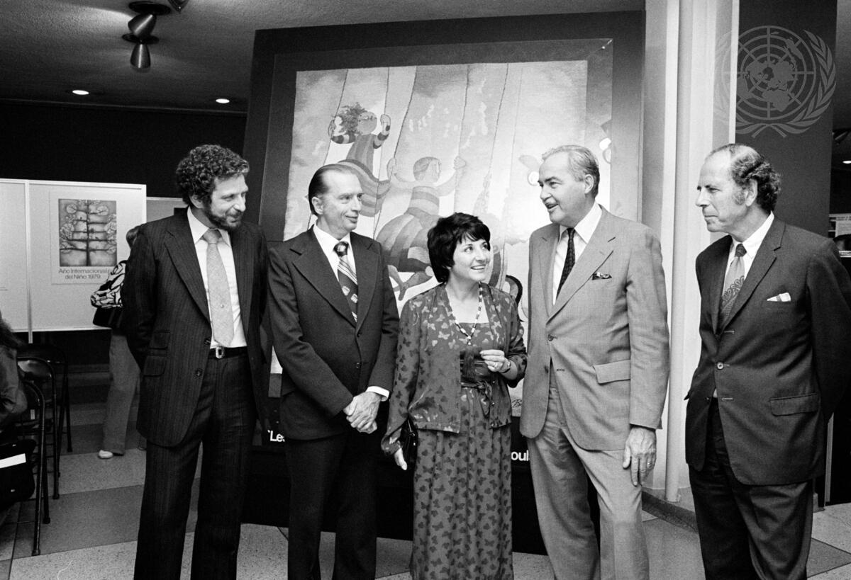 At today's opening ceremony were (l to r) Vincent Cassanetti, Lublin Graphics Inc.; William B. Buffum, Under-Secretary-General for Political and General Assembly Affairs; Graciela Rodo Boulanger; Charles A. Egger, Deputy Executive Director of UNICEF; and Edward B. Marus, Associate Director, IYC Secretariat.