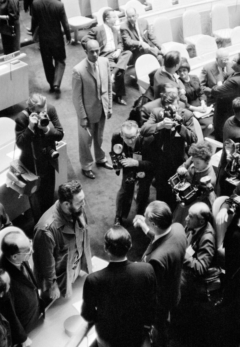 Here is a view of the floor of the Assembly Hall shortly before the opening meeting got under way as Premier Fidel Castro (standing at right, behind desk in foreground), of Cuba, and Foreign Minister Raúl Roa were about to take their seats in the Hall.