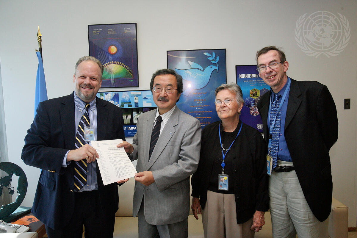 Kiyotaka Akasaka (second from left), Under-Secretary-General for Communications and Public Information (DPI), receives DPI/NGO 2007 Conference Declaration from Jeffery Huffines (left), Chair of the DPI/NGO Executive Committee; accompanied by Joan Kirby (second from right), former Chair of the DPI/NGO Executive Committee; and Richard Jordan, Chair of the Sixtieth Annual DPI/NGO Conference, at UN Headquarters in New York.