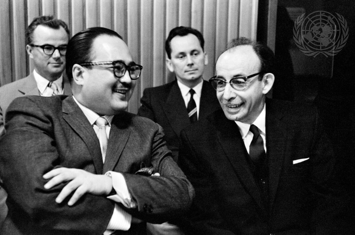 Seen here in the conference room shortly before the meeting got under way are Ambassador Rishikesh Shaha (left), of Nepal, and Dr. Raúl Roa, Minister for External Relations of Cuba.