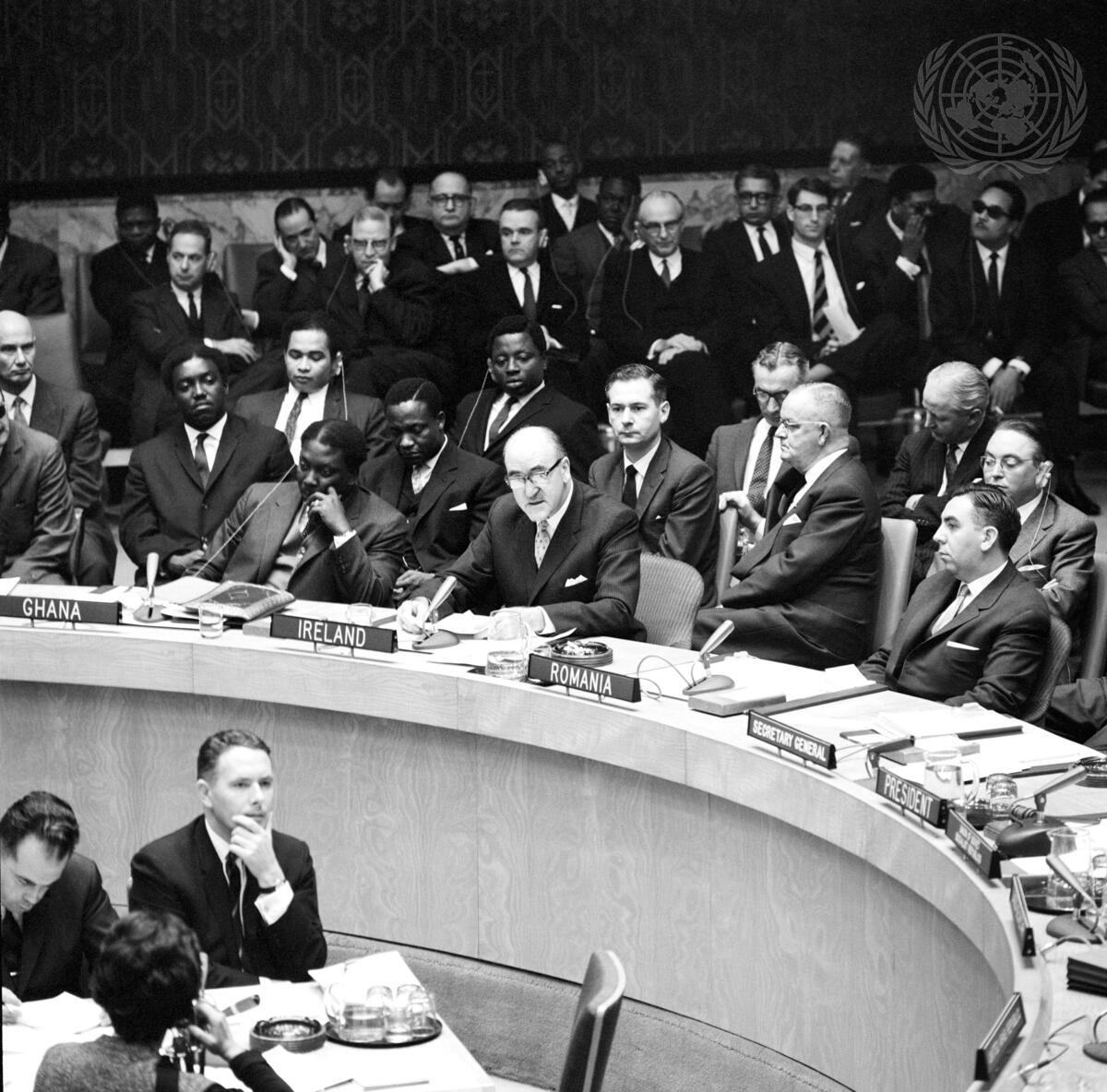 Mr. Frank Aiken (center, at table), Minister for External Affairs of Ireland, addressing the Council. At the table with him are Mr. A. Quaison-Sackey (left) of Ghana, and Prof Mihail Haseganu of Romania.