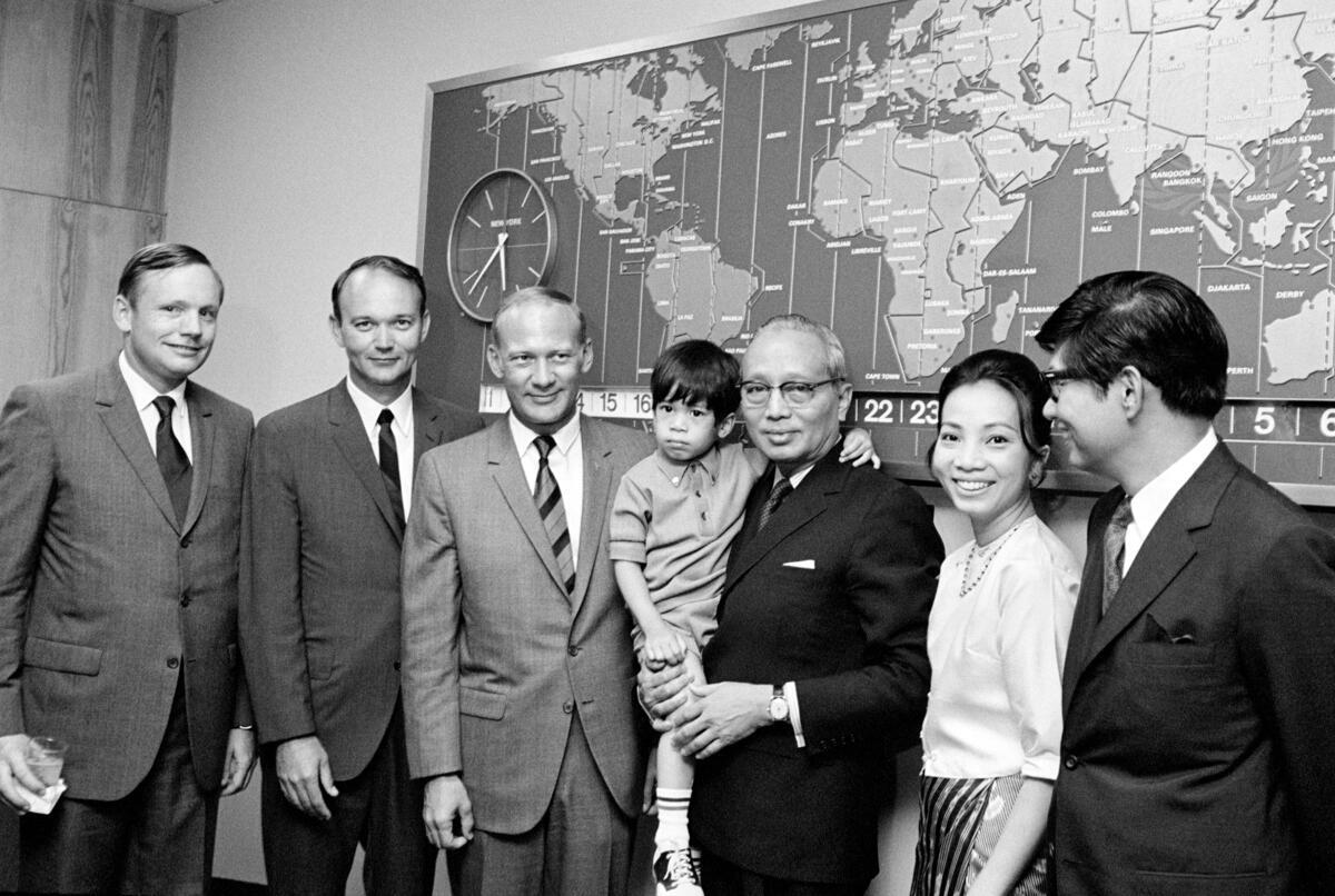 Seen here in an informal view, the Astronauts pose with the Secretary-General and his family. From left to right: Neil A. Armstrong, Michael Collins, Edwin E. Aldrin Jr.; U Thant with his grandson, Thant Myint-U; Aye Aye Myint-U, the Secretary-General's daughter; and her husband, Dr. Tyn Myint-U.