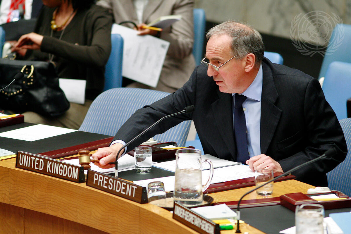Kim Howells, Minister of State at the Foreign and Commonwealth Office of the United Kingdom, and President of the Security Council for April, presides over the Council meeting on the situation in the Middle East, including the question of Palestine, at UN Headquarters in New York.