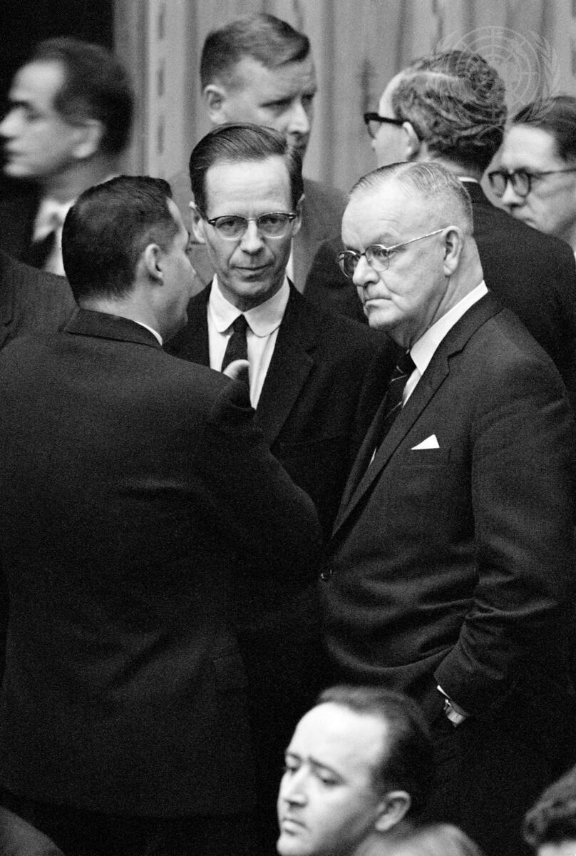 Conversing, prior to the meeting are (l. to r.): Dr. Carlos Sosa Rodriguez (Venezuela), Mr. Charles W. Yost (United States), and Mr. F. H. Boland (Ireland).