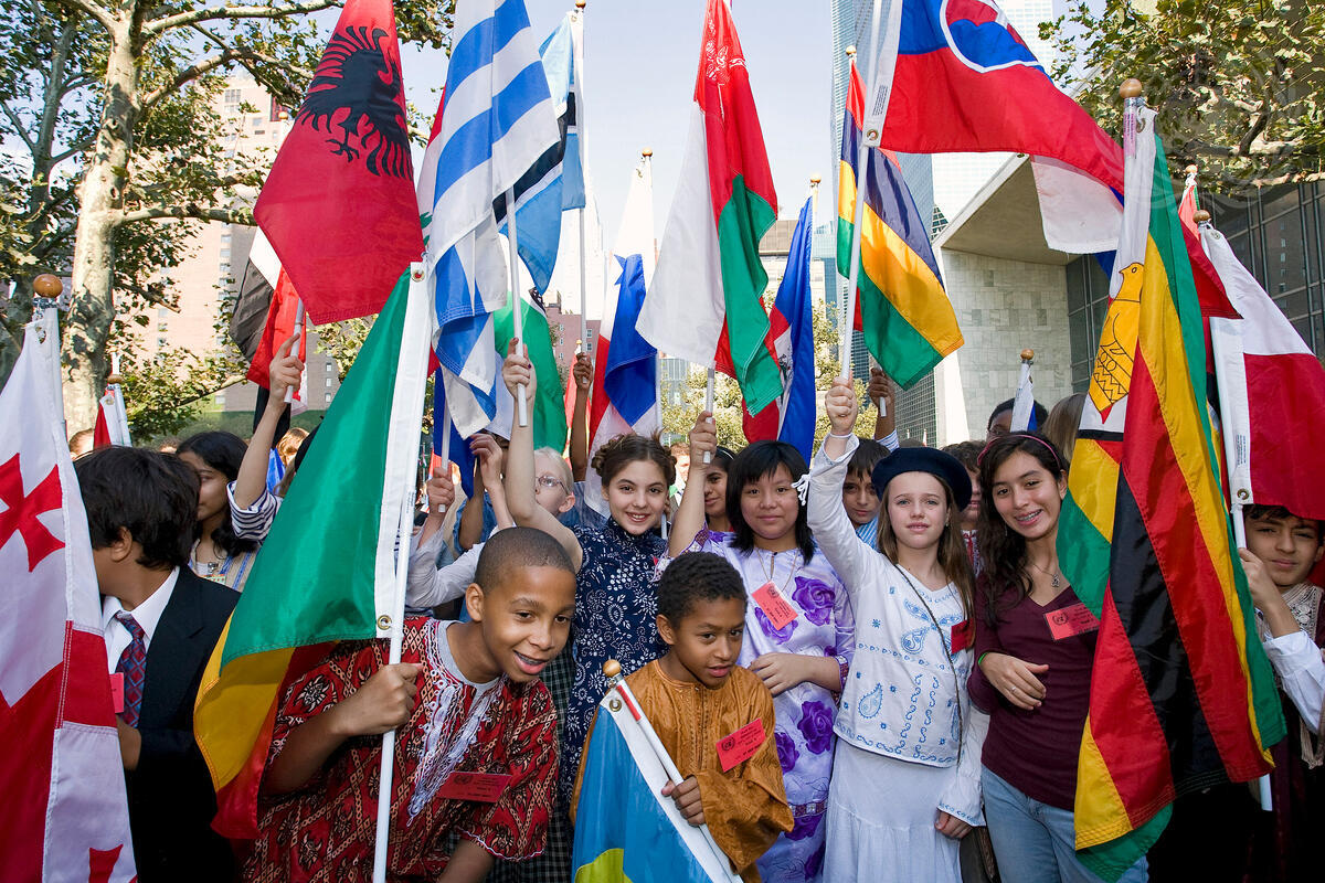 Cheerful young students in their traditional dress proudly waive their national flags during the Peace Bell ceremony of the observance of the International Day of Peace: ""Peace - A Climate for Change"", at UN Headquarters in New York.