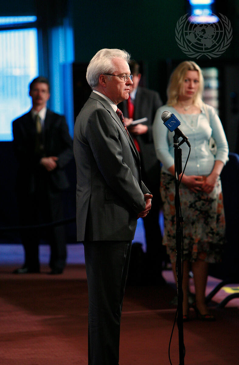 Vitaly I. Churkin, Permanent Representative of the Russian Federation to the UN, speaks to correspondents outside the Security Council chamber after the Council's consultative meeting on Kosovo, at UN Headquarters in New York.
