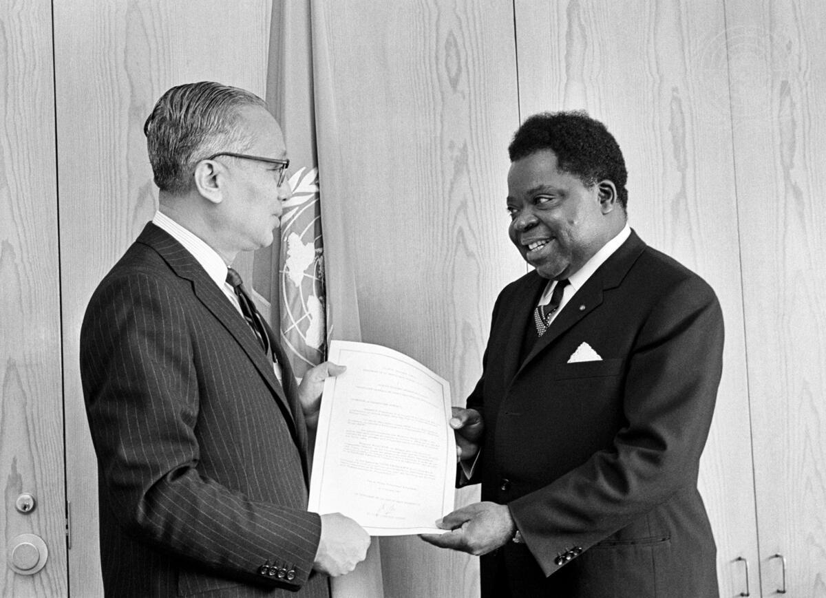 Michel NJINE (right), the new Permanent Representative of the Federal Republic of Cameroon to the United Nations, presenting his credentials to Secretary-General U THANT at UN Headquarters today.