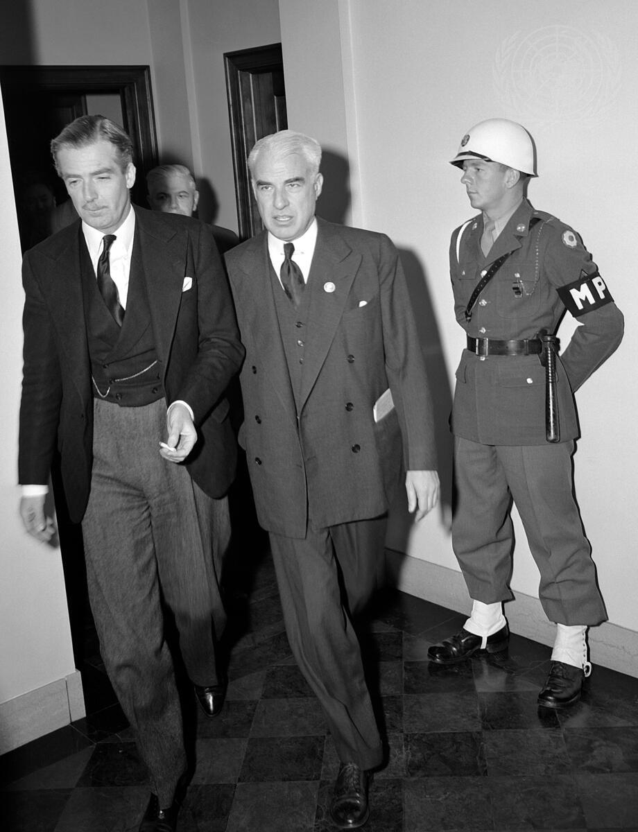 Anthony Eden (left), Secretary of State for Foreign Affairs and Chairman of the Delegation of the United Kingdom, and Edward R. Stettinius, Jr., Secretary of State and Chairman of the delegation of the United States, leaving the Executive Committee Meeting, 8 May 1945.