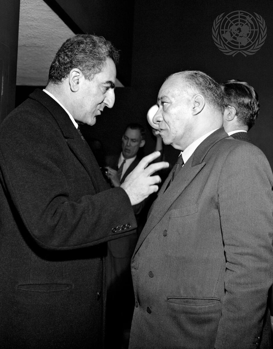 Mr. Charles Malik (left), the delegate of Lebanon, conversing, before the meeting, with Dr. Mahmoud Azmi, of Egypt. Egypt is not, at present, a member of the Council but, accordingly to the rules of procedure, any member of the United Nations which is not a member of the Council may participate, without vote, in the Council's discussions of a question if the Council considers that the member's interests are specially affected.