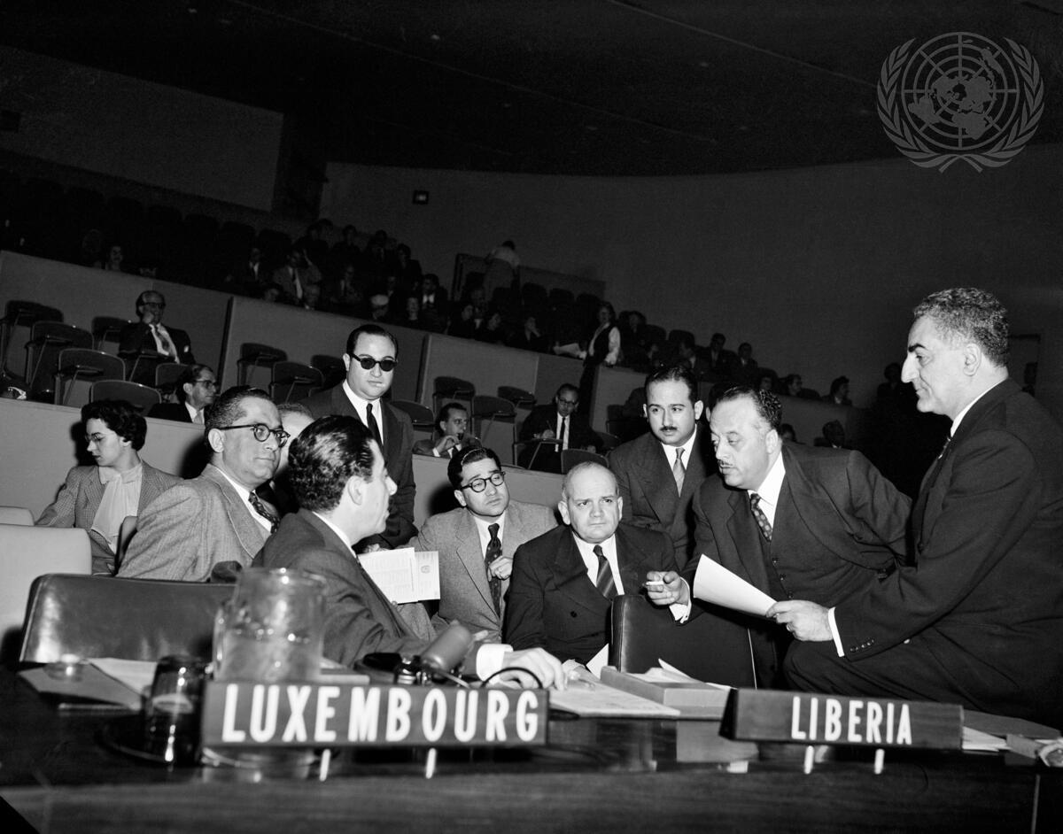 Before a meeting of the Assembly's First (Political and Security) Committee, a group of delegates from Middle Eastern countries having an informal discussion on the Cyprus question. They are (left to right): Dr. Karim Azkoul and Mr. Edward Rizk, both from Lebanon; General Mahmoud Riad, of Egypt; Mr. Ata Abdul Wahab, of Iraq; Mr. Omar Loutfi and Mr. Ismail Fahmy, both of Egypt; Mr. Ahmed Shukairi, of Syria; and Dr. Charles Malik, of Lebanon.