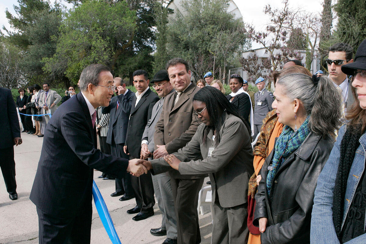 Secretary-General Ban Ki-moon shakes hands with the staff of the United Nations Truce Supervision Organization (UNTSO) at the Government House, in Jerusalem.