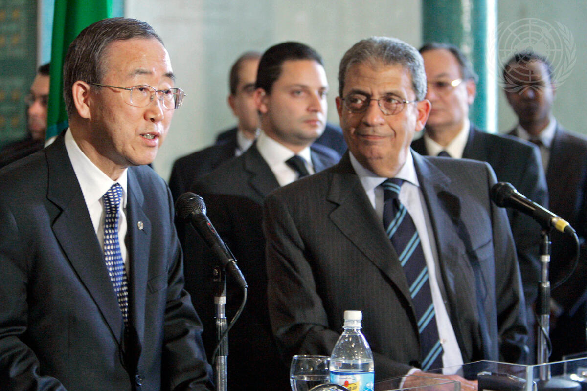 Secretary-General Ban Ki-moon (left) and Ahmed Aboul Gheit, Foreign Minister of Egypt, address a press conference after their meeting in Cairo, Egypt.