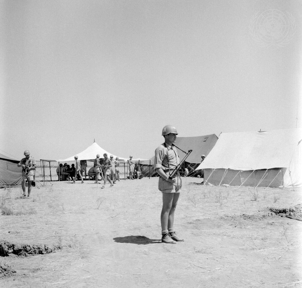 Line in the Gaza Strip and in the Sinai Desert. Troops from the ten nations which make up the United Nations Emergency Force first began to arrive in Egypt in November 1956. Today, they number some 6,000 officers and men.