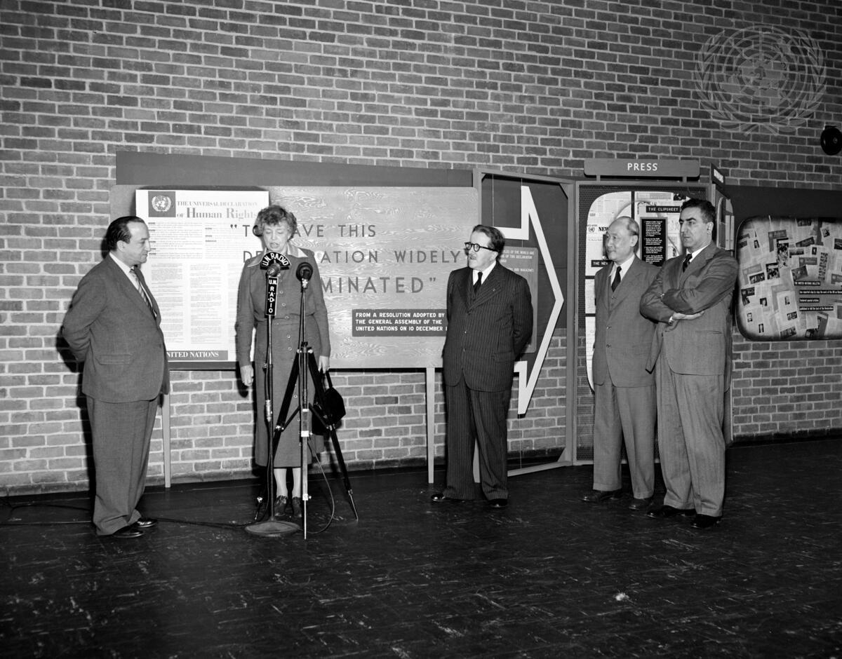 United States representative and Chairman of UN Commission on Human Rights, Mrs. Eleanor Roosevelt, speaking at inauguration ceremony of UN Department of Public Information Exhibition on Human Rights, in main Hall of UN Interim Headquarters. From left to right, are: Mr. Benjamin Cohen, Assistant Secretary-General for UN Department of Public Information; Mrs. Roosevelt; Mr. Henry Laugier, Assistant Secretary-General for UN Department of Social Affairs; Dr. P.C. Chang, of China, First Vice-Chairman of Commission; and Mr. Charles Malik, of Lebanon, Rapporteur.