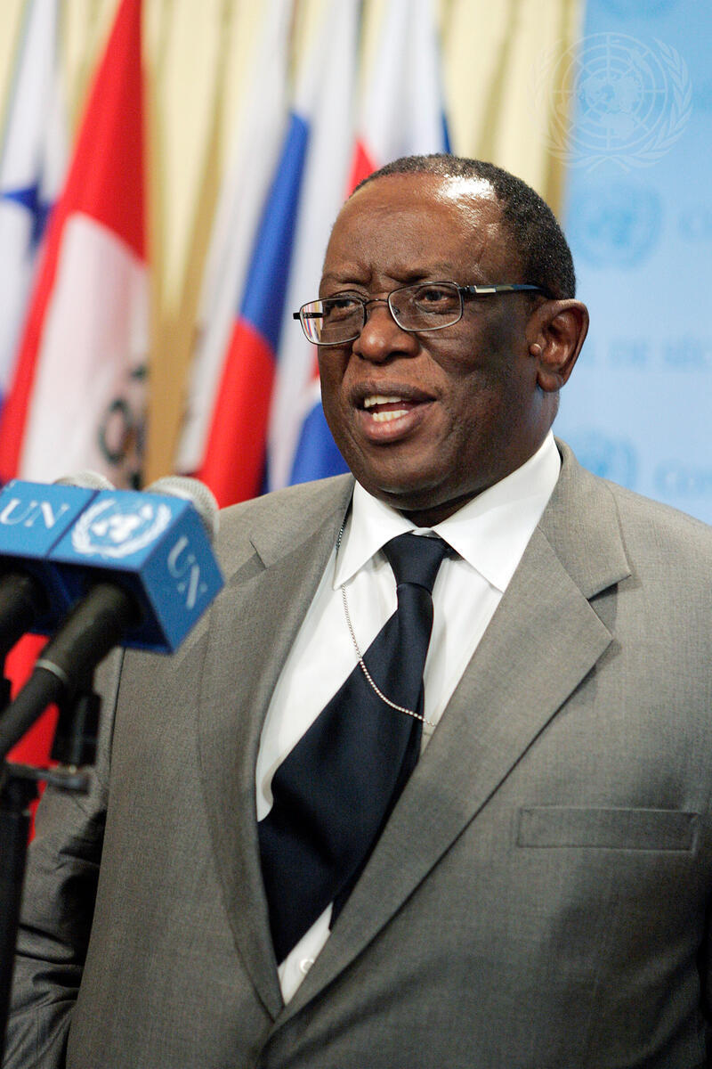 Dumisani Shadrack Kumalo, Permanent Representative of the Republic of South Africa to the United Nations, and President of the Security Council for March, briefs correspondents outside the Security Council chamber, at UN Headquarters in New York.