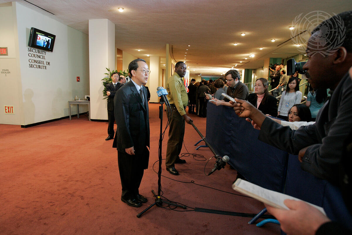 Guangya Wang, Permanent Representative of China to the United Nations, talks to correspondents outside the Security Council chamber, at UN Headquarters in New York.