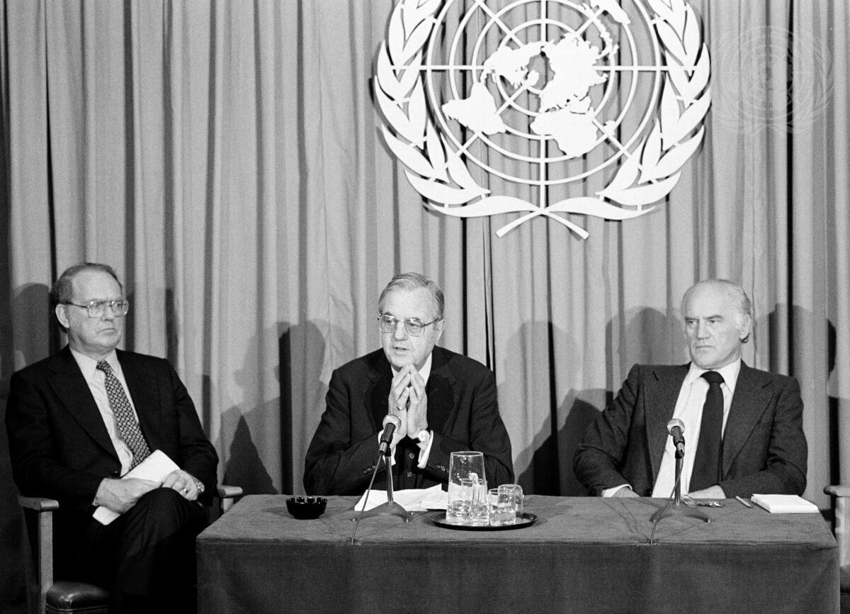 Olof Rydbeck (center), Commissioner General of UNRWA. Seated at left is Alan Brown, Deputy Commissioner-General of UNRWA, and at right is John A. Miles, Director of UNRWA's New York Liaison Office.