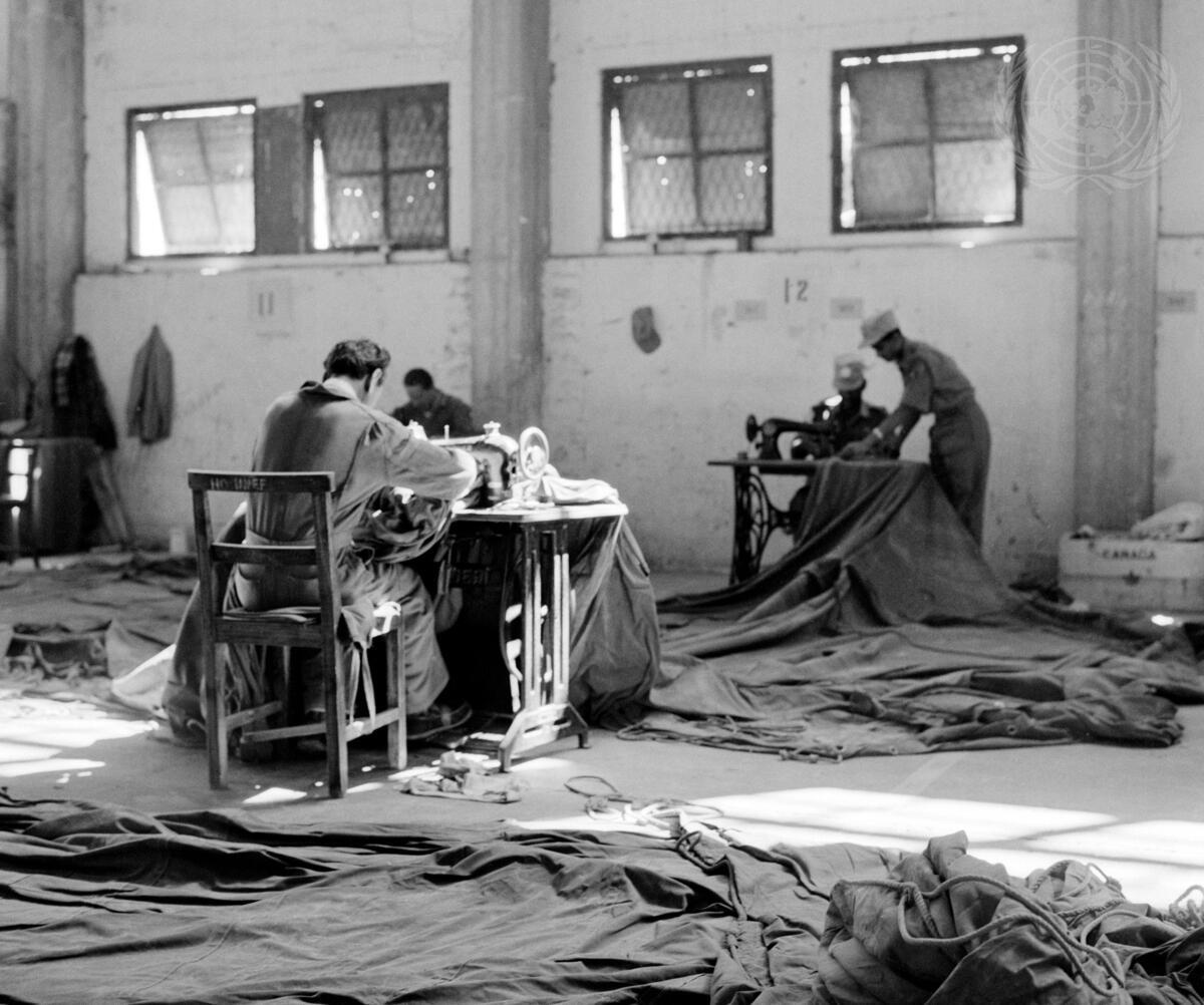 Repairing tents at the UNEF ordnance depot at Camp Rafah.